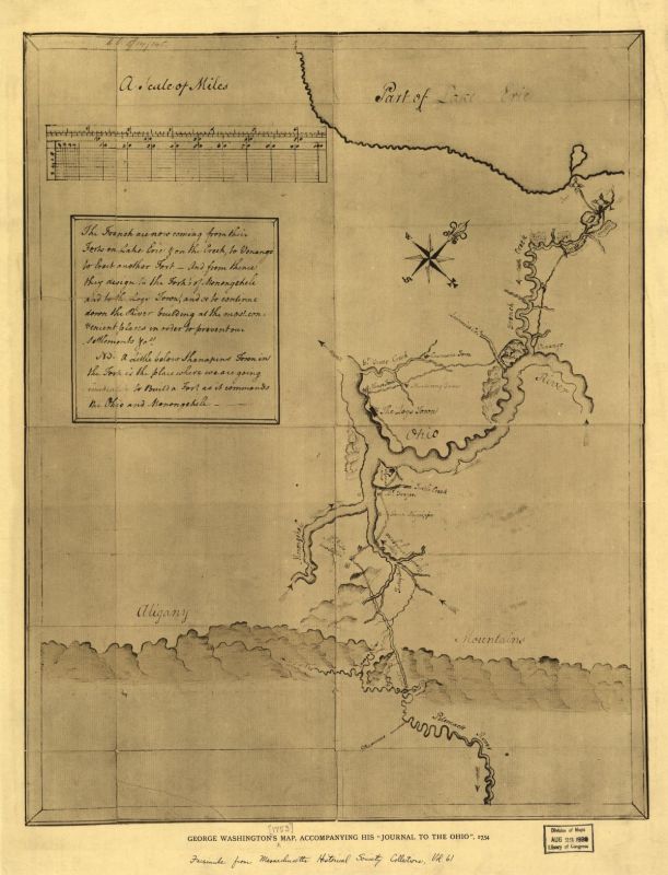 The French, however, also had their sights on the Ohio River Valley, and began its military occupation in 1753, building forts and driving out British traders. Governor Dinwiddie knew that a French occupation would sink the Ohio Company’s settlement plan, depriving the company of massive potential profits. He consulted with the British government in London, and was ordered to send a letter to the French, reiterating British claims on the area and warning them to stay away. Dinwiddie chose 21-year-old George Washington to deliver the letter. Washington held a major’s commission at the time, but was a complete military unknown with no combat experience. He was, however, considered the most knowledgeable non-Native expert on the region’s geography due to his earlier survey work, and had the trust of both the Virginia government and the Ohio Company (in which he was an investor).